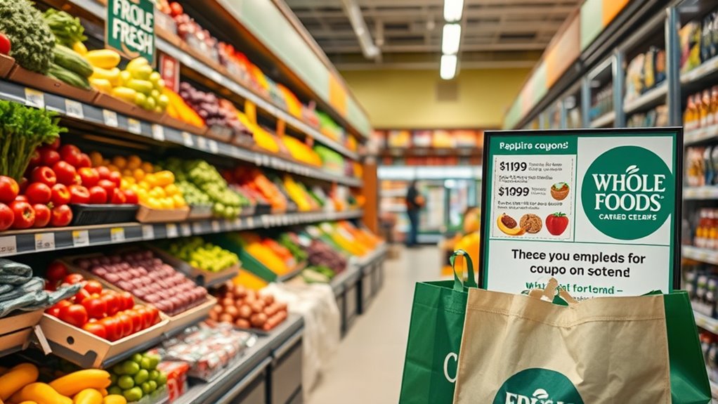 At Amazon Fresh and Whole Foods, digital coupons are easily accessible via their apps or websites. You can browse, clip, and automatically apply discounts at checkout without physical coupons. Prime members get early access to special deals and personalized offers, saving you even more. Loyalty programs reward regular shoppers with additional savings and tailored discounts. To maximize your savings and simplify your shopping experience, explore how these digital policies work together for your benefit.