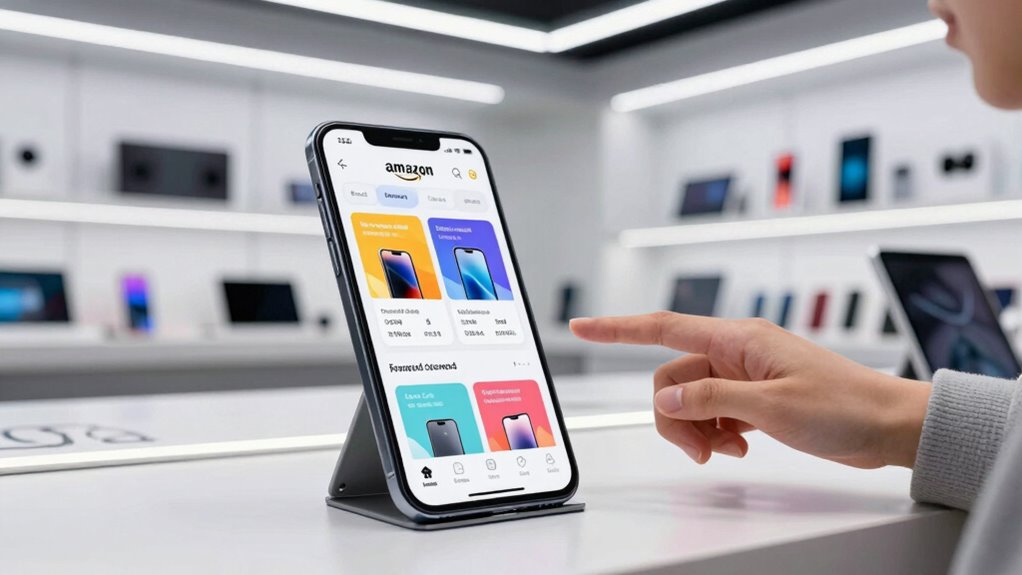 Amazon’s app promotions have considerably influenced how you shop, making it easier to discover deals and save money. These promotions highlight a shift toward mobile optimization, reflecting how much consumers now rely on smartphones for their purchasing decisions. When you open the Amazon app, you’re greeted with personalized offers, flash sales, and limited-time discounts designed specifically for mobile users. This focus on mobile optimization guarantees that your shopping experience feels seamless, whether you’re browsing on a phone or a tablet. The app’s layout is intuitive, with quick access to deals and easy navigation, encouraging you to stay engaged longer and make faster purchasing decisions. Additionally, these targeted promotions often employ personalization algorithms that analyze your browsing and purchase history to present you with more relevant deals, further influencing your shopping habits.