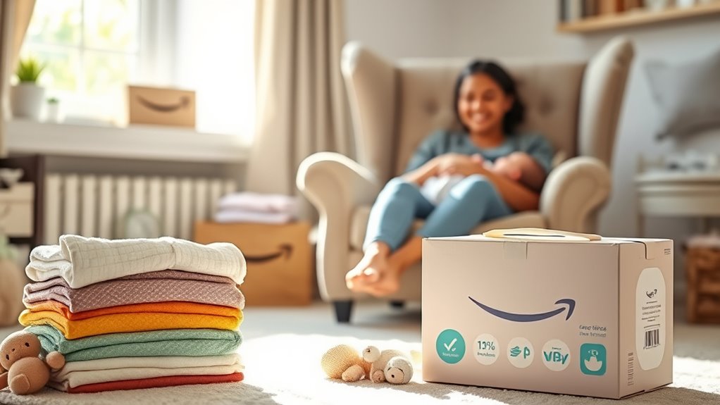 By joining the Amazon Family program, you can access exclusive discounts on baby essentials like diapers, baby food, and more, saving you money. Diaper subscriptions let you set up automatic deliveries, reduce last-minute trips, and customize sizes and delivery frequency. These services help keep your baby comfortable and your budget in check while ensuring you always have what you need on hand. Keep exploring to discover how to maximize these savings and simplify your baby care.