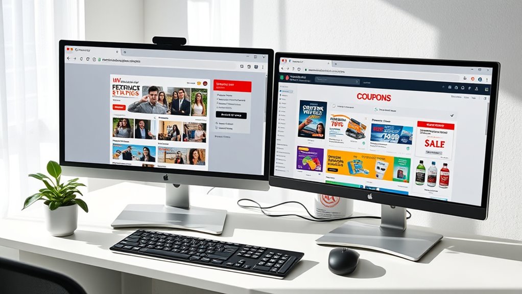 To set up browser profiles for work and coupon shopping, start by clicking the profile icon in your browser and choosing “Add profile” or similar options. Name each profile clearly, like “Work” or “Shopping,” and customize them with different themes or avatars. Sign into each profile with separate accounts to keep data isolated. This setup keeps your work and shopping activities organized, private, and distraction-free. If you continue here, you’ll discover simple steps to make this process even easier.
