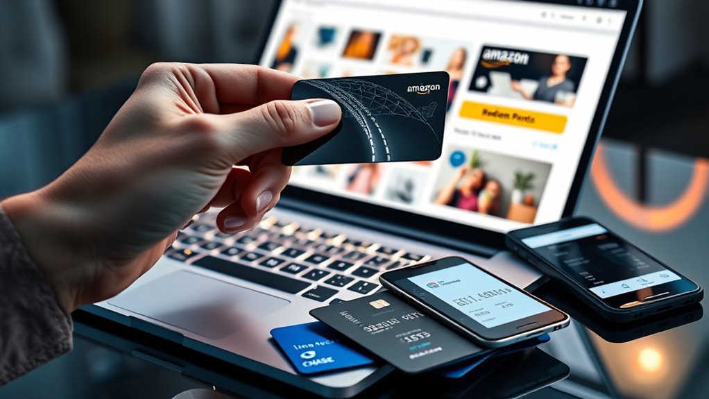 To spend your credit card points on Amazon, you can redeem gift cards directly through your issuer’s portal, transfer points to travel partners for better value, or use shopping portals linked to your card. Some cards, like American Express and Chase, offer seamless options for applying points toward Amazon purchases or earning cashback. Explore your rewards options to maximize value and discover simple ways to turn points into Amazon savings—more tips await as you explore further.