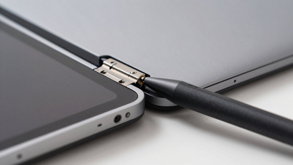 You should regularly clean your hinge and stylus components to avoid buildup that’s worse than a hurricane. Check the hinge for loose screws and tighten if needed, preserving its hinge aesthetic. For your stylus, keep the tip clean and guarantee ergonomic comfort by replacing worn tips. Lubricate hinges occasionally with a tiny amount of appropriate lubricant to keep them smooth. Proper maintenance keeps your device looking sleek and functioning flawlessly.