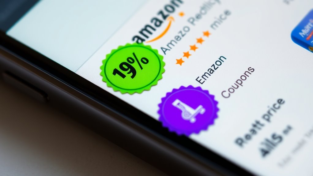 When browsing Amazon on your mobile device, you might notice various coupon badges next to product listings. These badges serve as quick visual cues, alerting you to discounts and special offers that could save you money. Recognizing these badges is essential for making informed purchasing decisions, especially when you’re trying to compare options quickly. The discount display on the app is designed to be straightforward, with badges typically showing a percentage off or a dollar amount saved. By understanding what these badges mean, you can easily identify which products are offering the best deals without having to dig through lengthy descriptions or fine print.