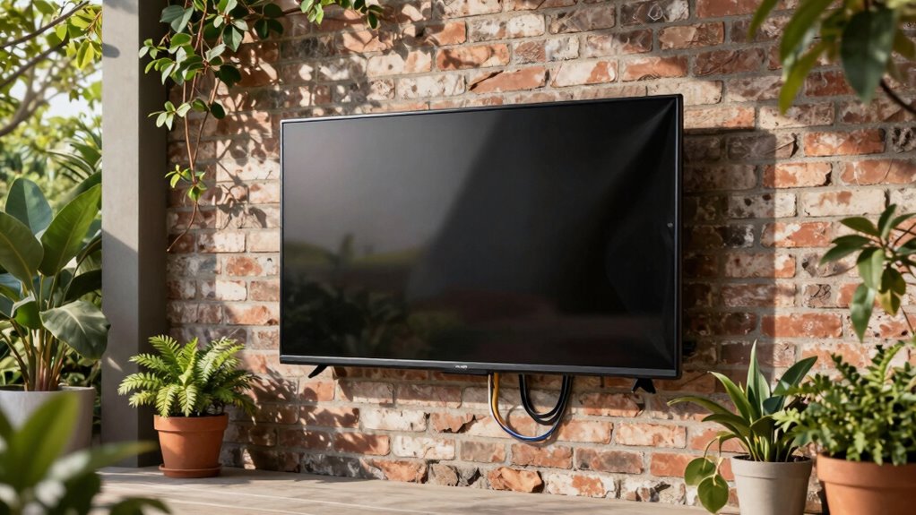 Installing an outdoor TV might seem straightforward, but many people make a common mistake that can lead to costly damage. One of the biggest errors is neglecting proper rain protection. Even if your patio is covered, unexpected weather changes can occur. Rain or high humidity can seep into your TV’s electronics if it’s not specifically designed for outdoor use. This oversight can cause long-term damage, leading to expensive repairs or replacement. To avoid this, you need a TV that’s rated for outdoor conditions, with sealed enclosures and weatherproof panels. Additionally, consider installing protective covers or enclosures that shield your TV during storms or heavy rainfall, even if it’s weather-resistant. Proper rain protection isn’t just about preventing immediate damage; it also extends the lifespan of your outdoor entertainment setup. Understanding weatherproof ratings can help you make informed choices when selecting outdoor electronics. It’s also wise to regularly inspect your setup for any signs of wear or potential vulnerabilities to ensure continued protection. Ensuring your setup is weatherproofed properly can significantly reduce the risk of damage caused by unexpected weather conditions. Incorporating appropriate maintenance practices can further safeguard your investment over time.