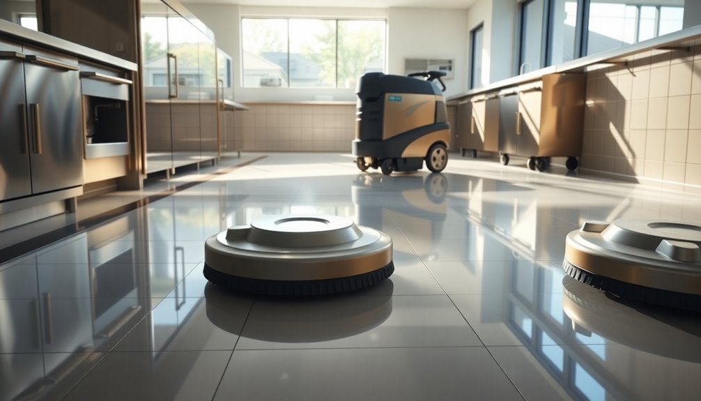 When I search for the best automatic floor scrubbers for commercial kitchens, I look for models that offer powerful motors, long battery life, and effective cleaning for different surfaces. The Prolux Core series and Emotor machines stand out for their efficiency and user-friendly designs. I also consider factors like weight and maneuverability to make cleaning easier. If you're curious about the top options and what to keep in mind when choosing, there's more insight to come!